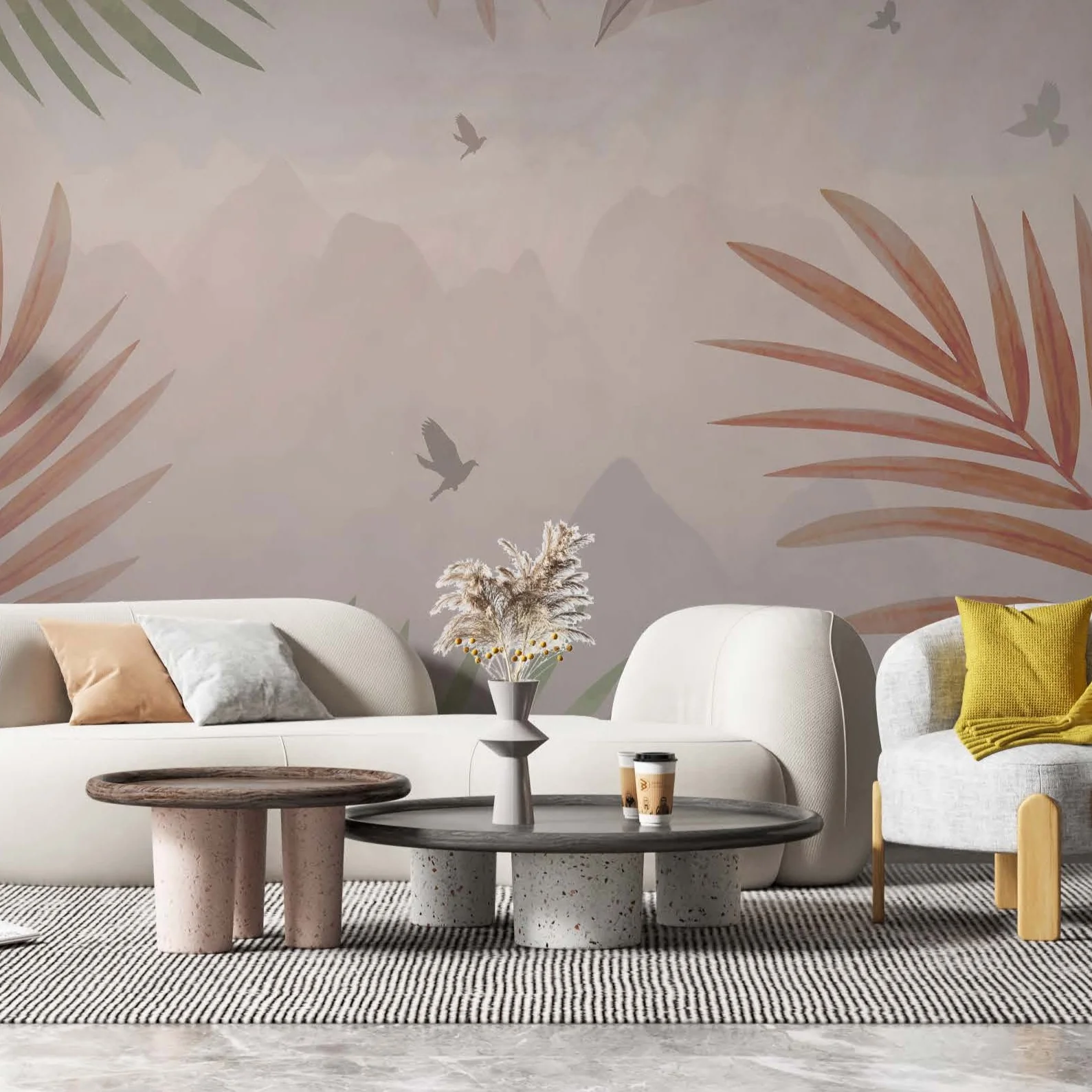Soft tropical botanical wallpaper with palm leaves and birds for living room or bedroom featuring warm beige tones and calm nature-inspired wall art