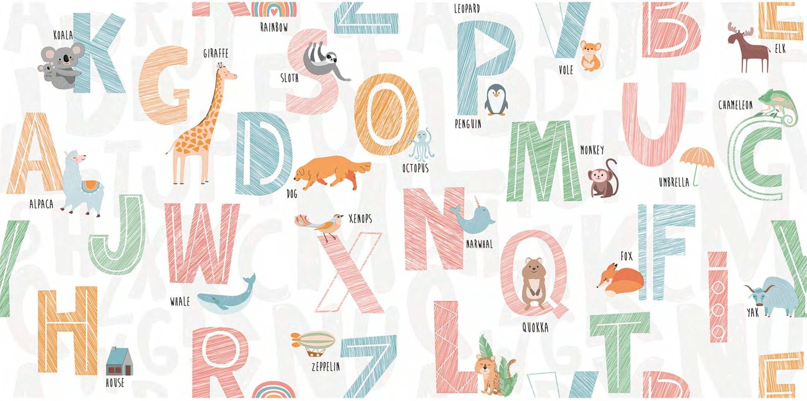Alphabet animal standard wallpaper — playful ABC design with safari animals for kids’ rooms, classrooms, or nurseries.