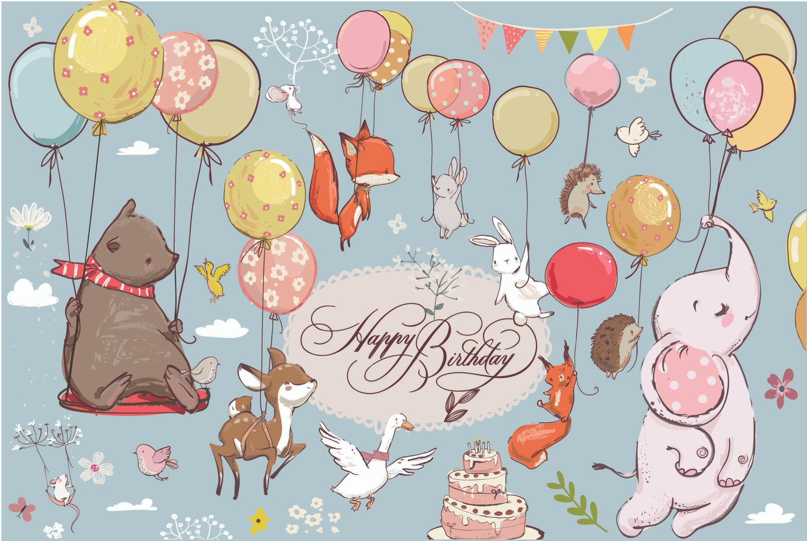 Cute animal birthday kids wallpaper with balloons, elephant, fox, and bunny characters, perfect for nursery or playroom with fun woodland celebration theme.