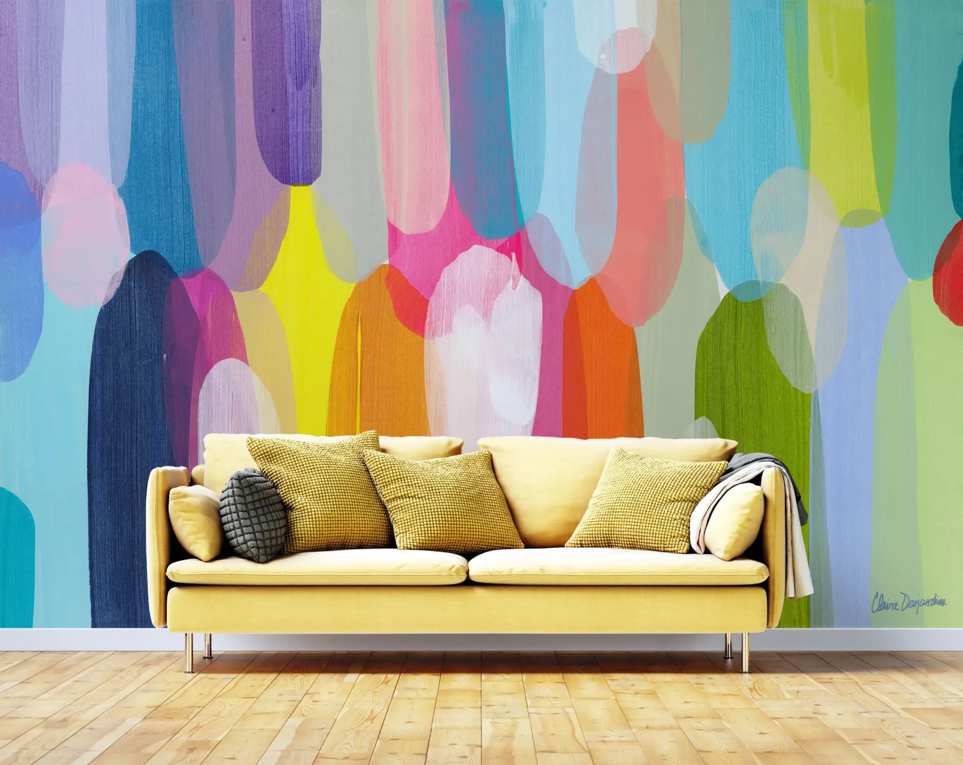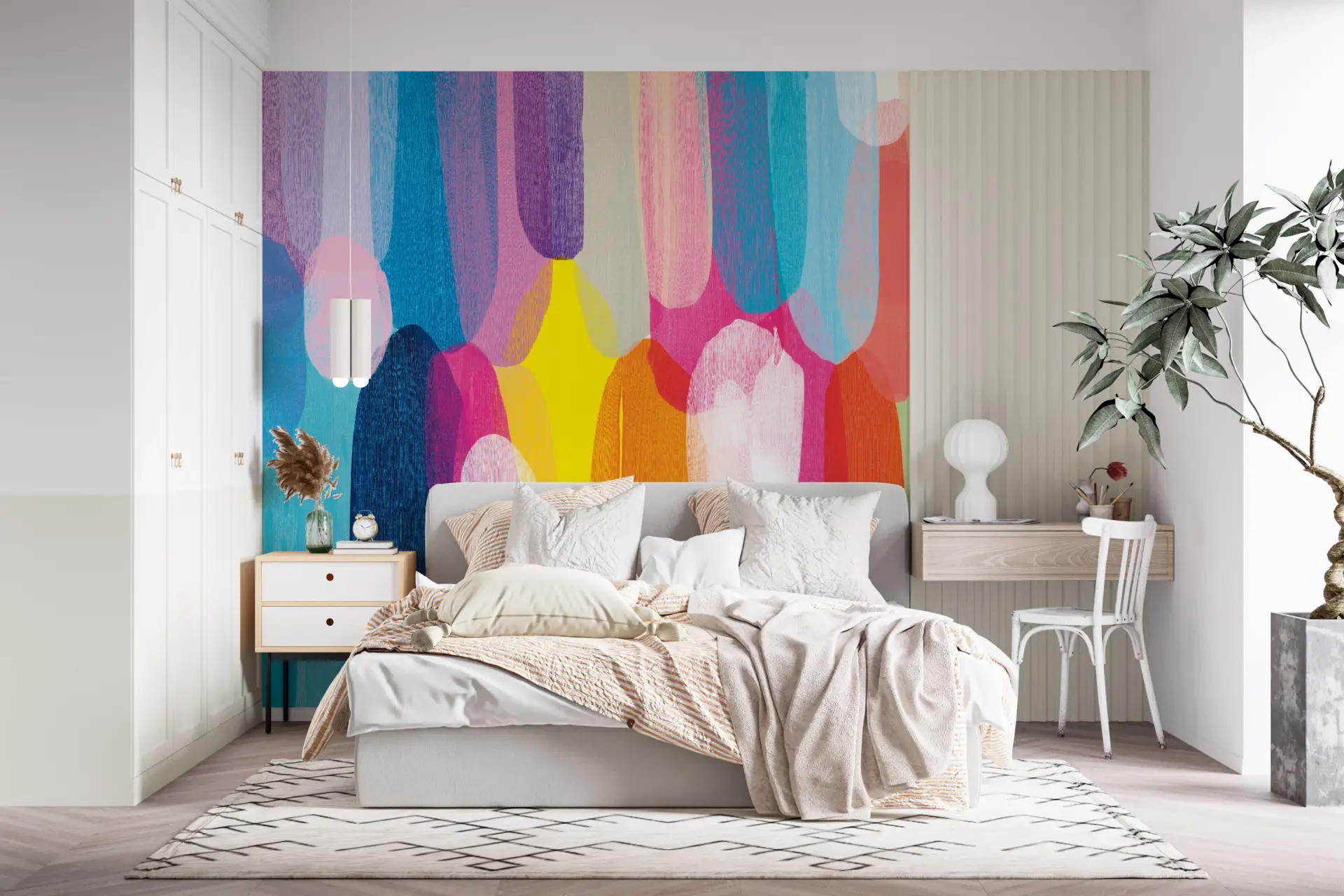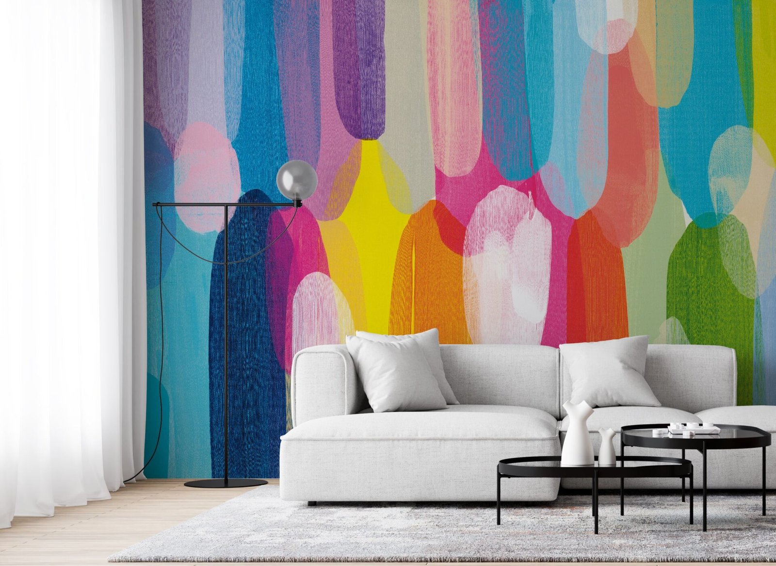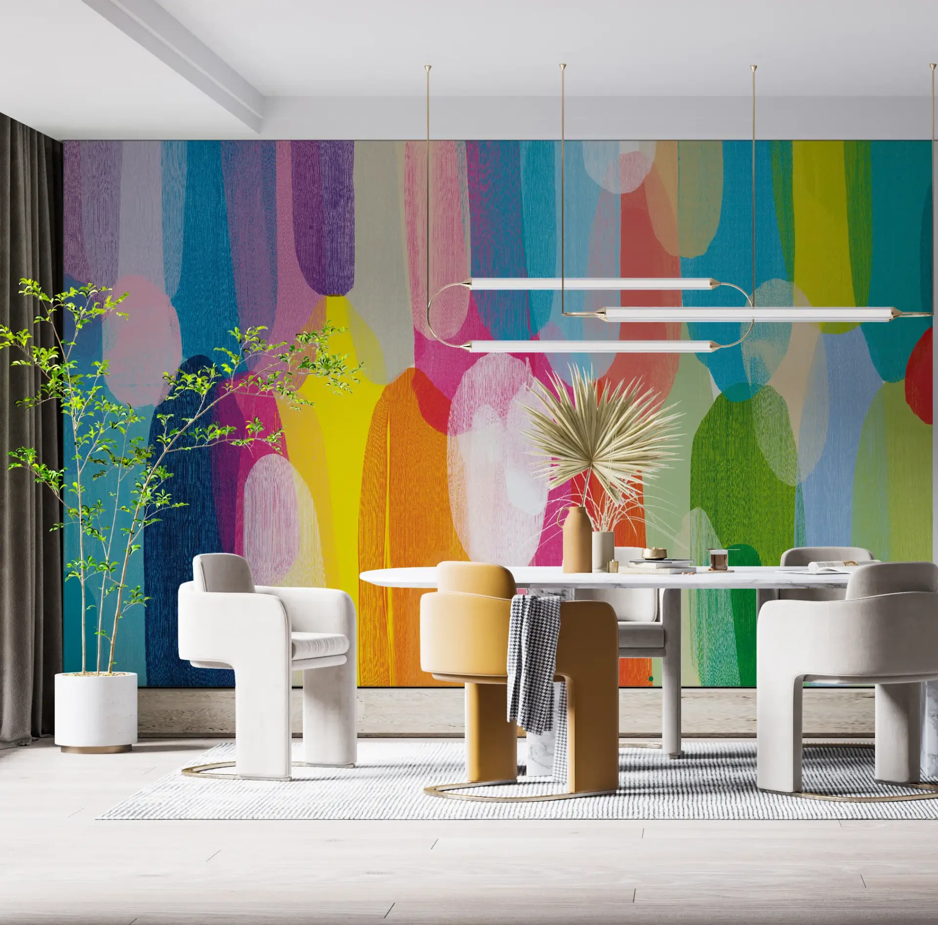 Modern abstract colorful wallpaper with painterly brush strokes for living room, bedroom, dining area, or creative interior walls.