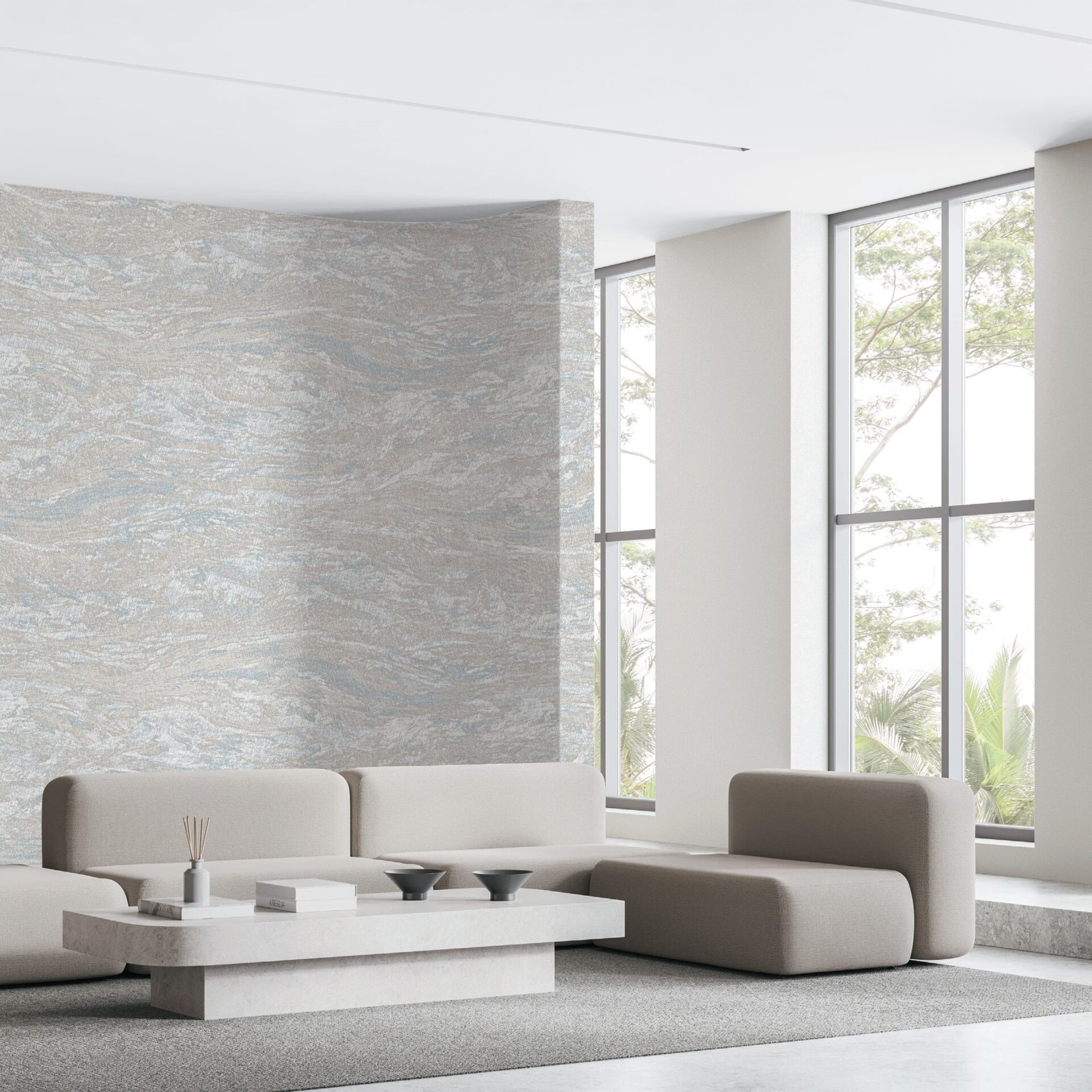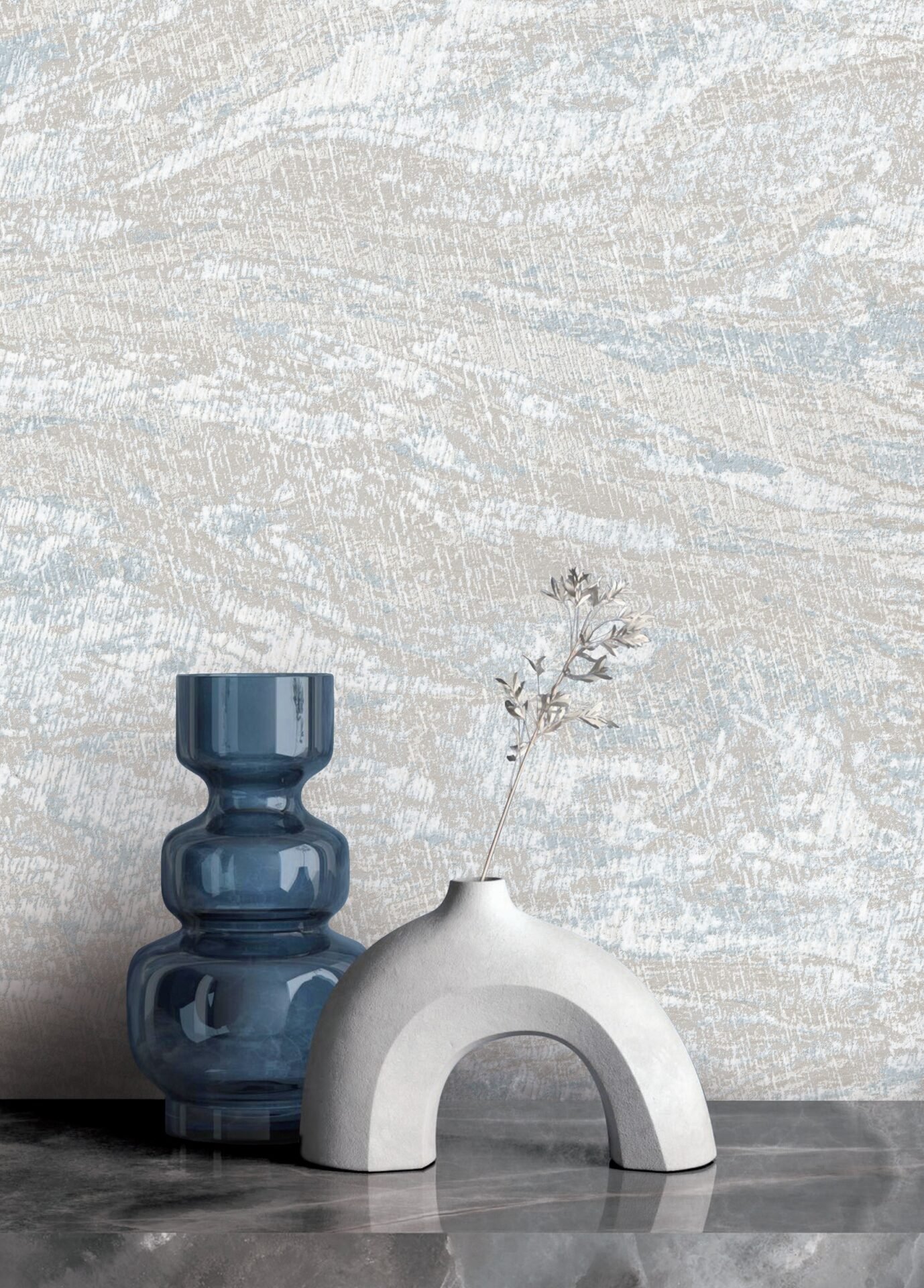 Luxury abstract beige and blue textured wallpaper for living room and bedroom walls with modern artistic mineral wall decor.