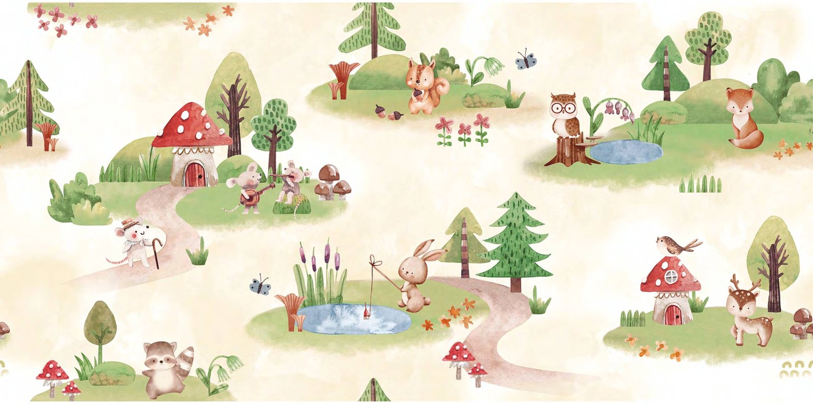 Cozy Critters standard wallpaper — adorable forest animals and mushroom houses in a watercolor woodland theme for kids’ rooms and nurseries.