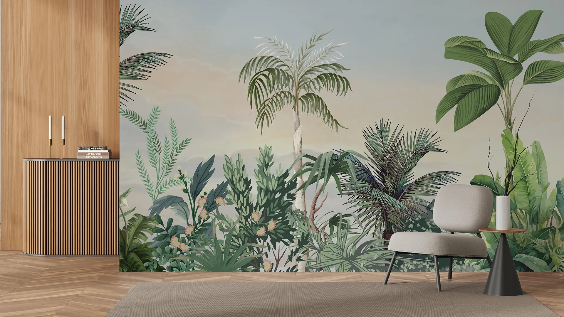 Elegant tropical forest wallpaper with layered green foliage for living room, bedroom, or lounge featuring calm botanical wall art and nature-inspired design