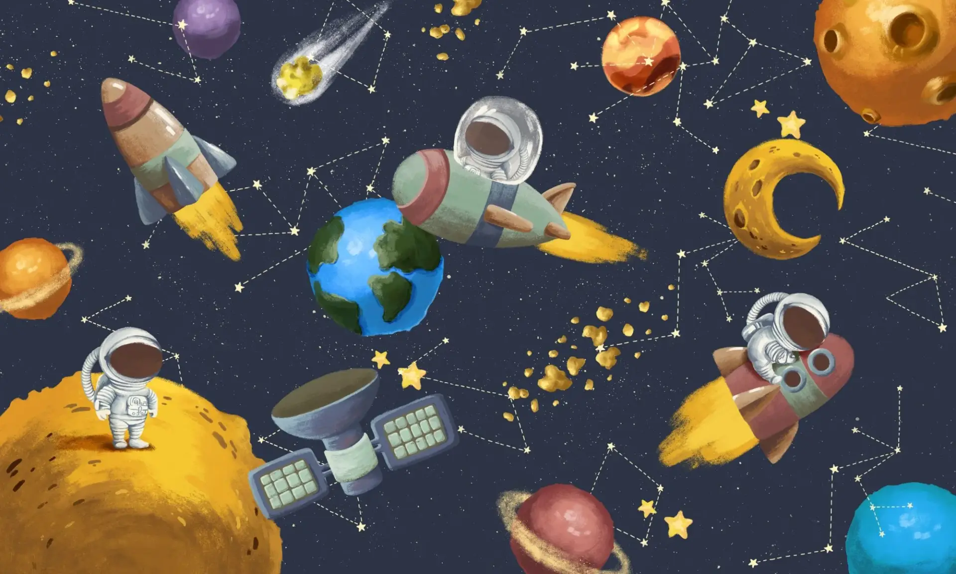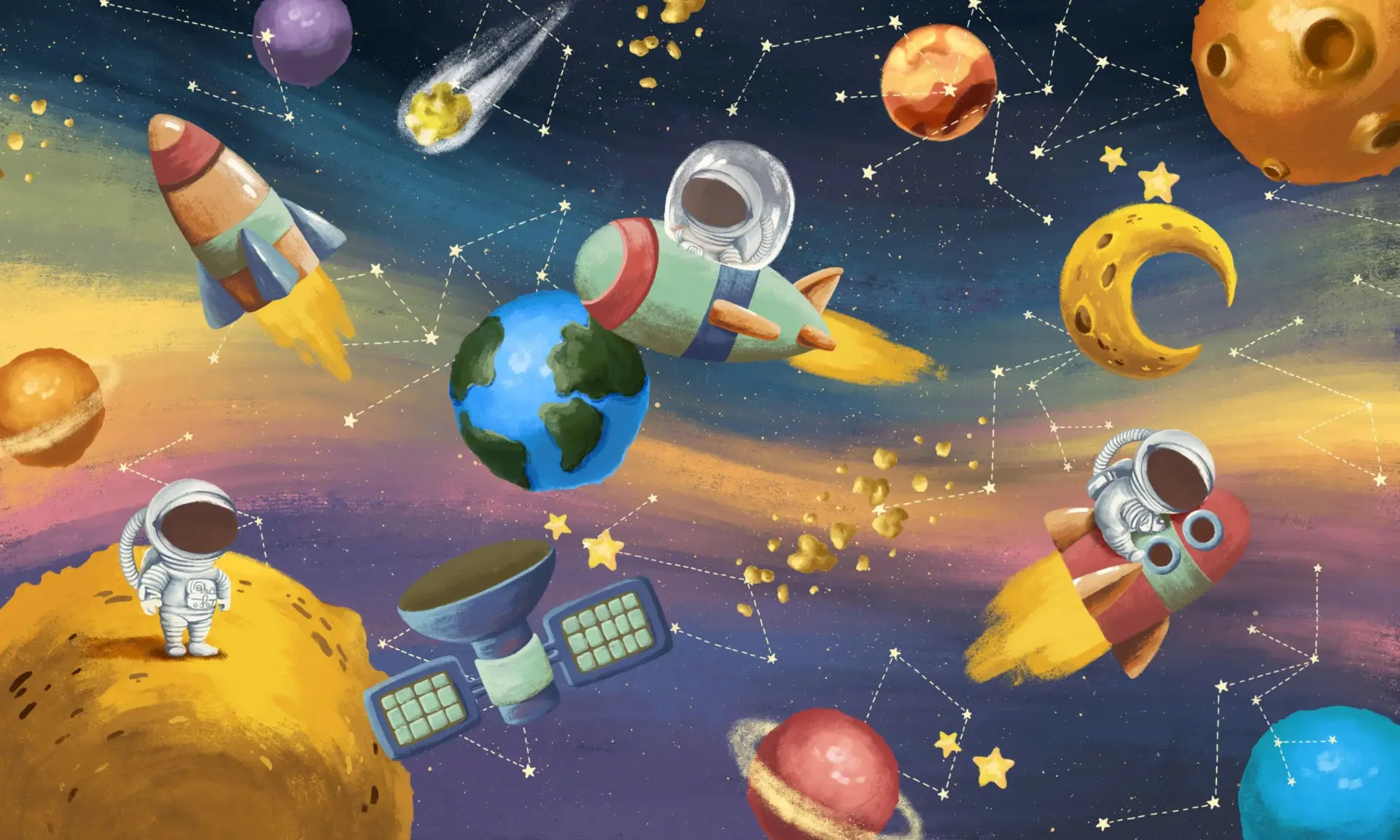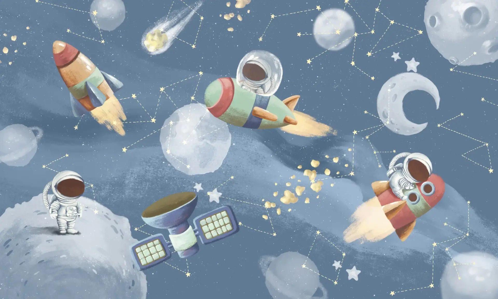 Kids space wallpaper with rockets, planets, and astronauts wall art for child bedroom, nursery, or playroom galaxy theme decor.