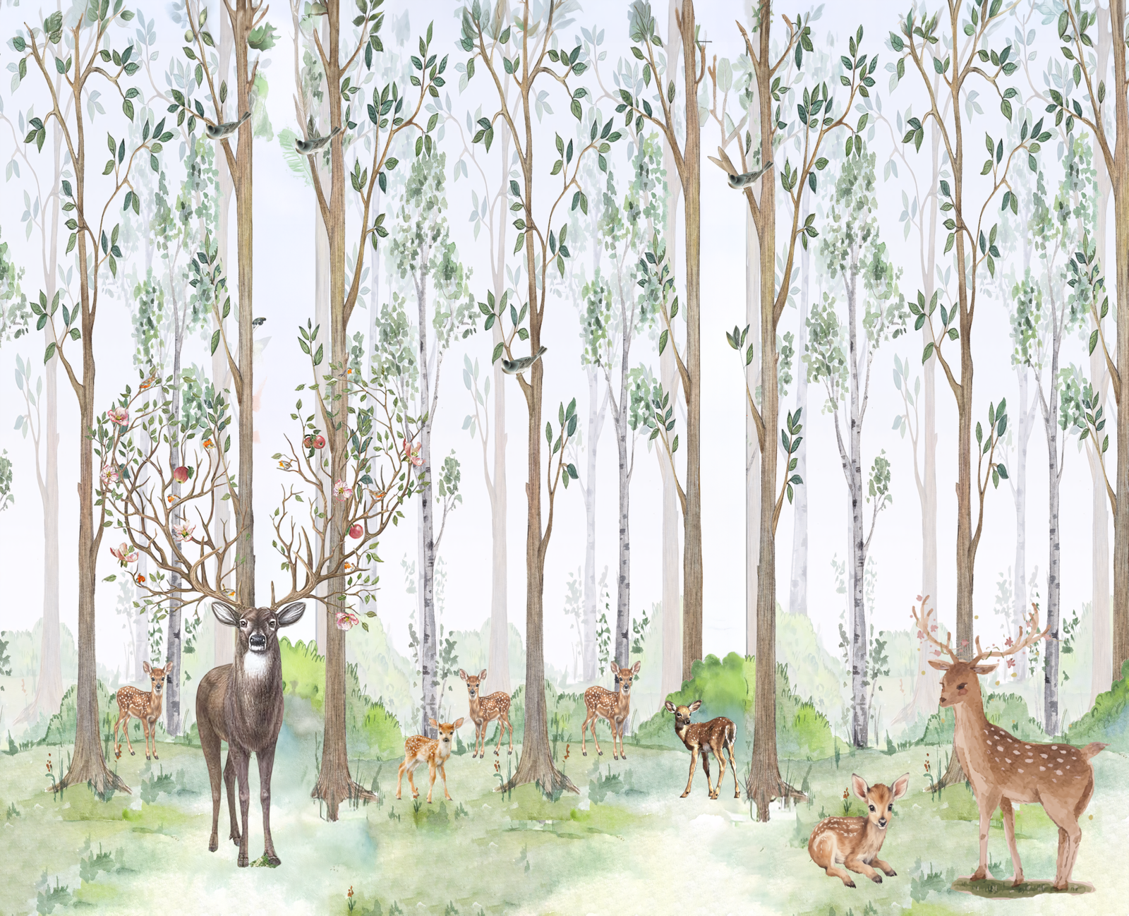 Watercolor woodland animals wallpaper with deer and forest trees for kids bedroom, nursery, or playroom wall decor