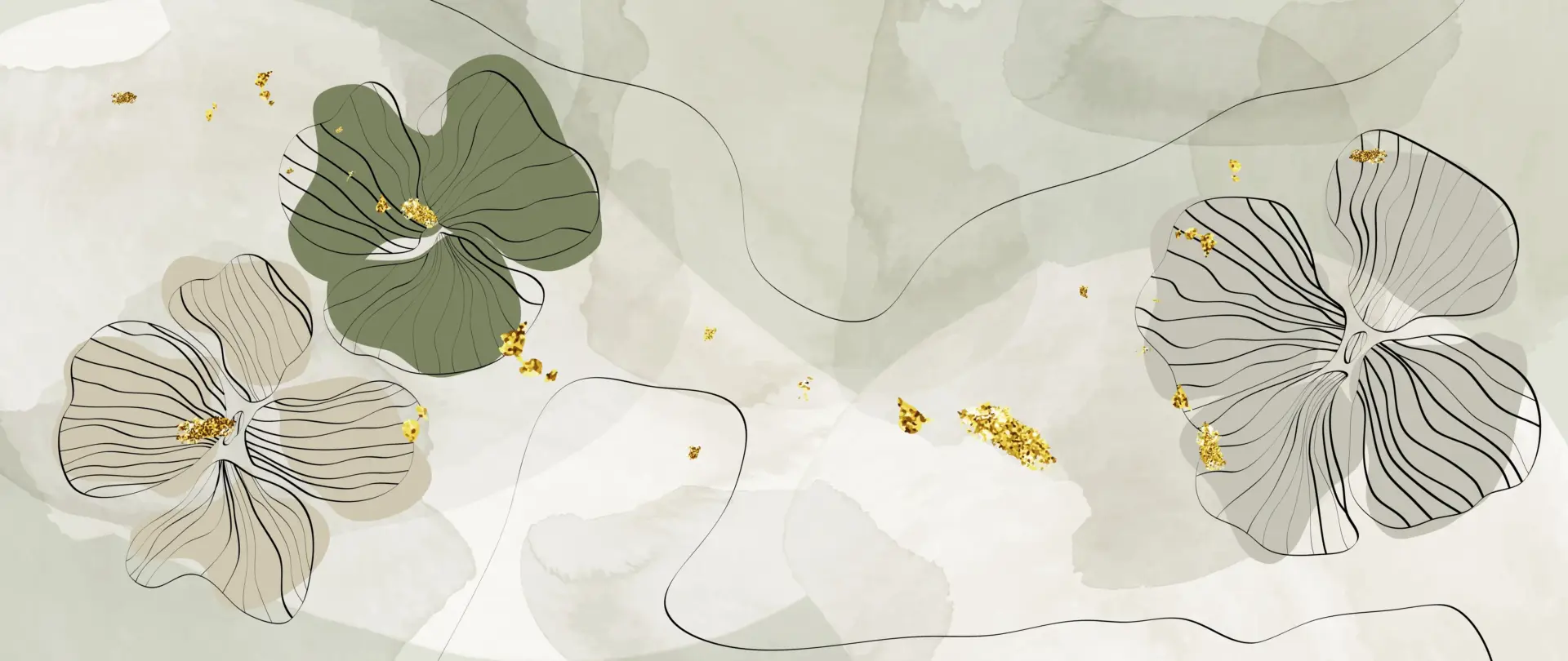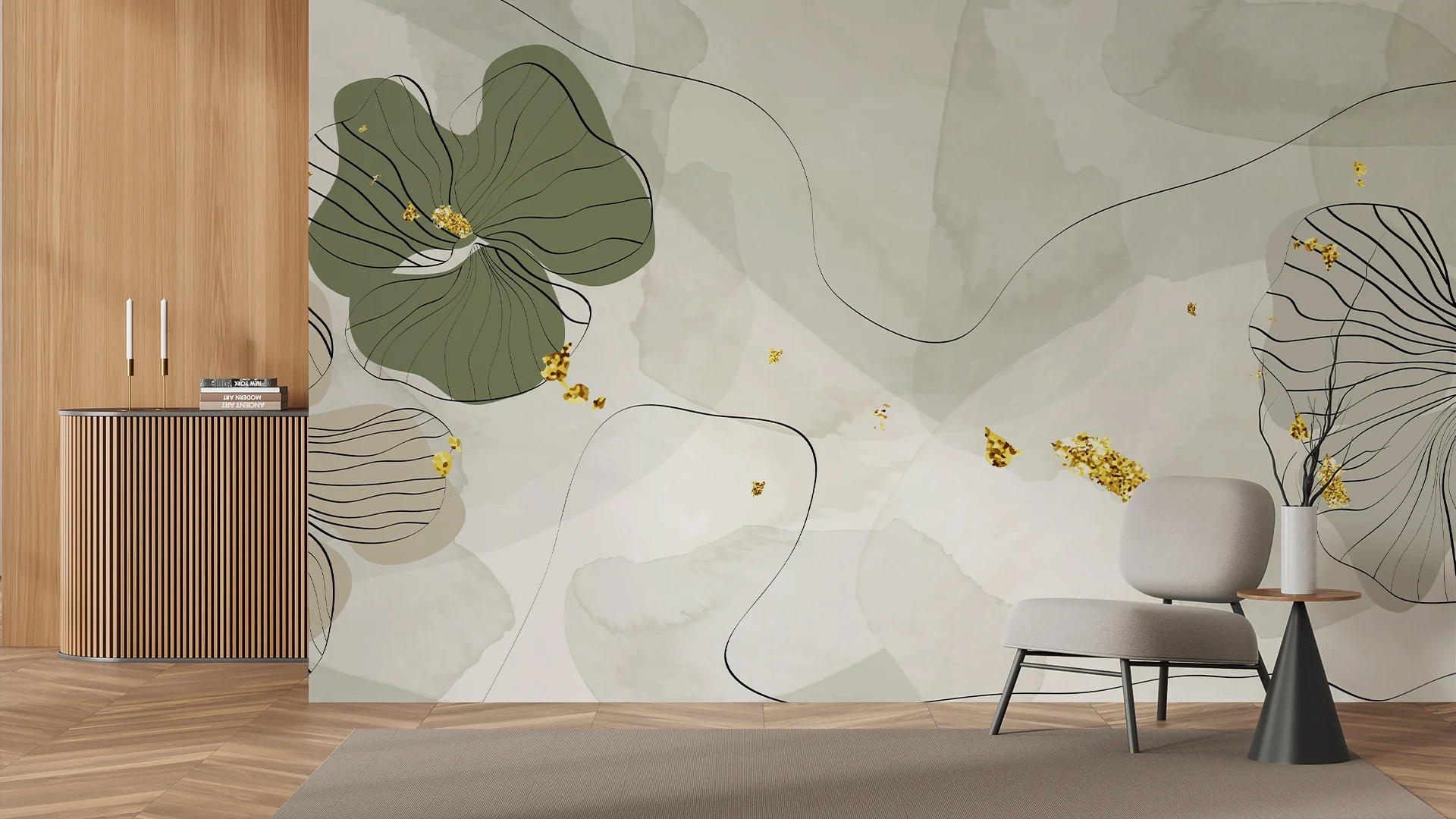 Modern abstract botanical wallpaper with sage green florals and subtle gold accents for elegant living room, bedroom, or office interiors.