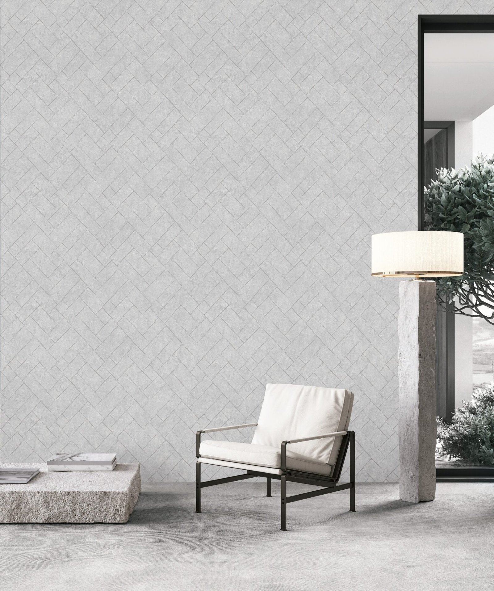 Modern grey herringbone stone texture wallpaper for living room and bedroom walls with elegant architectural wall decor design.
