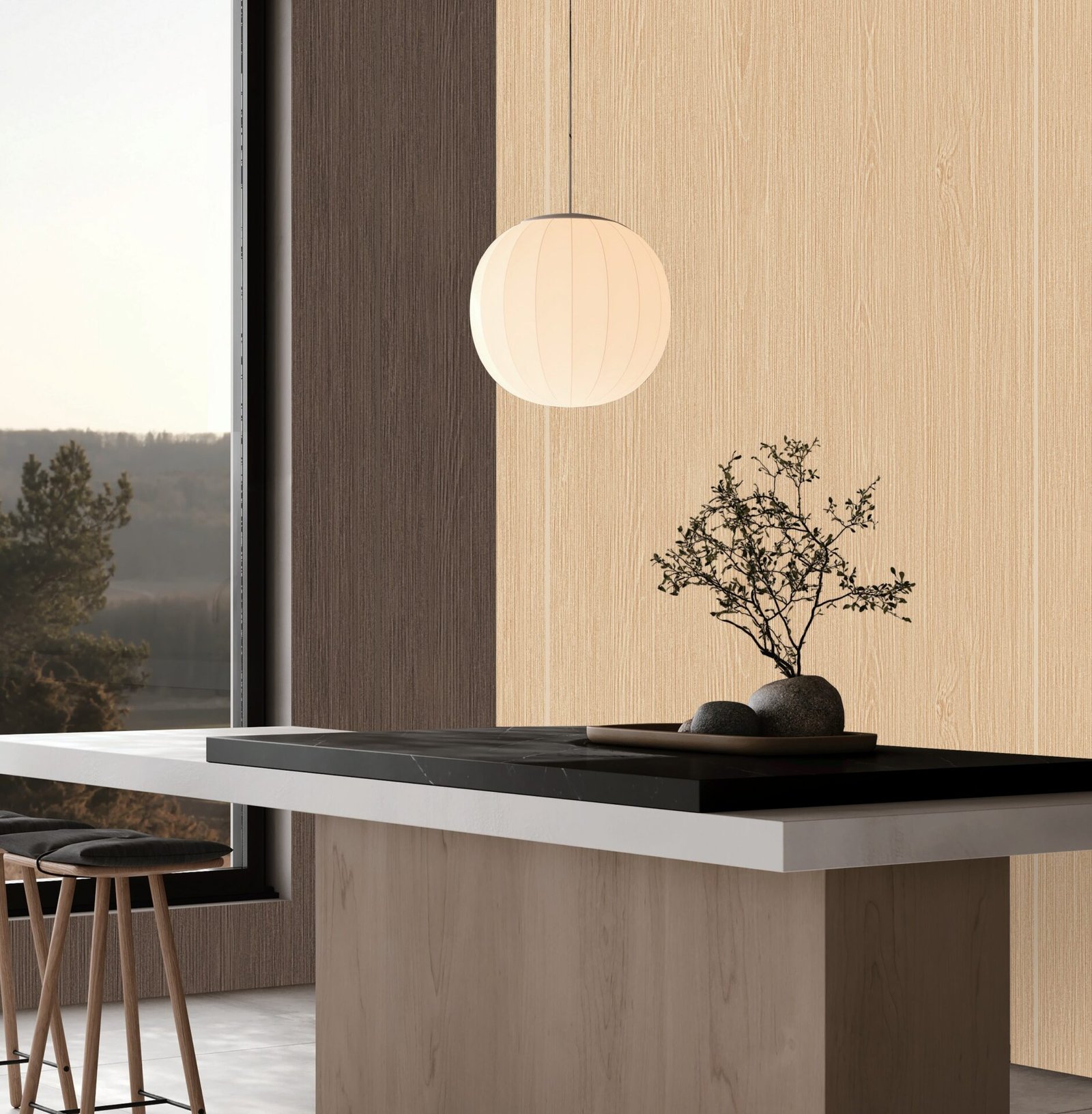 Modern vertical wood texture wallpaper for living room and dining space walls with warm natural luxury wall decor design.