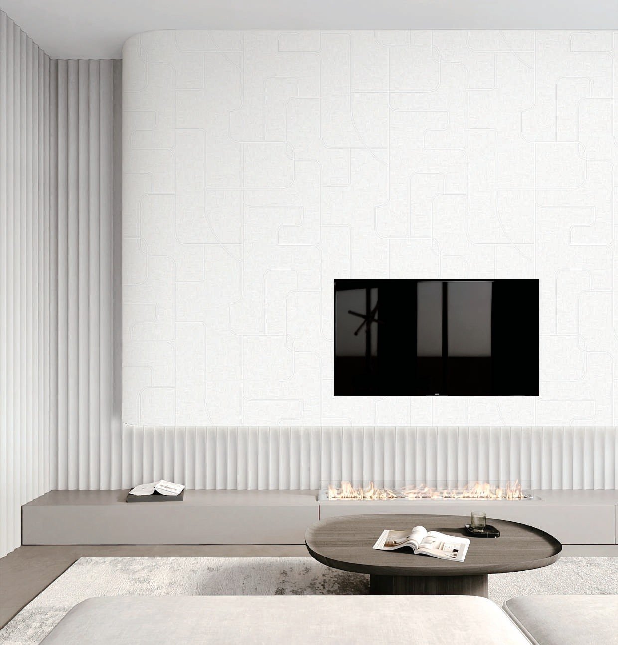 Modern abstract beige wallpaper with soft geometric lines for living room feature wall and elegant contemporary interior design