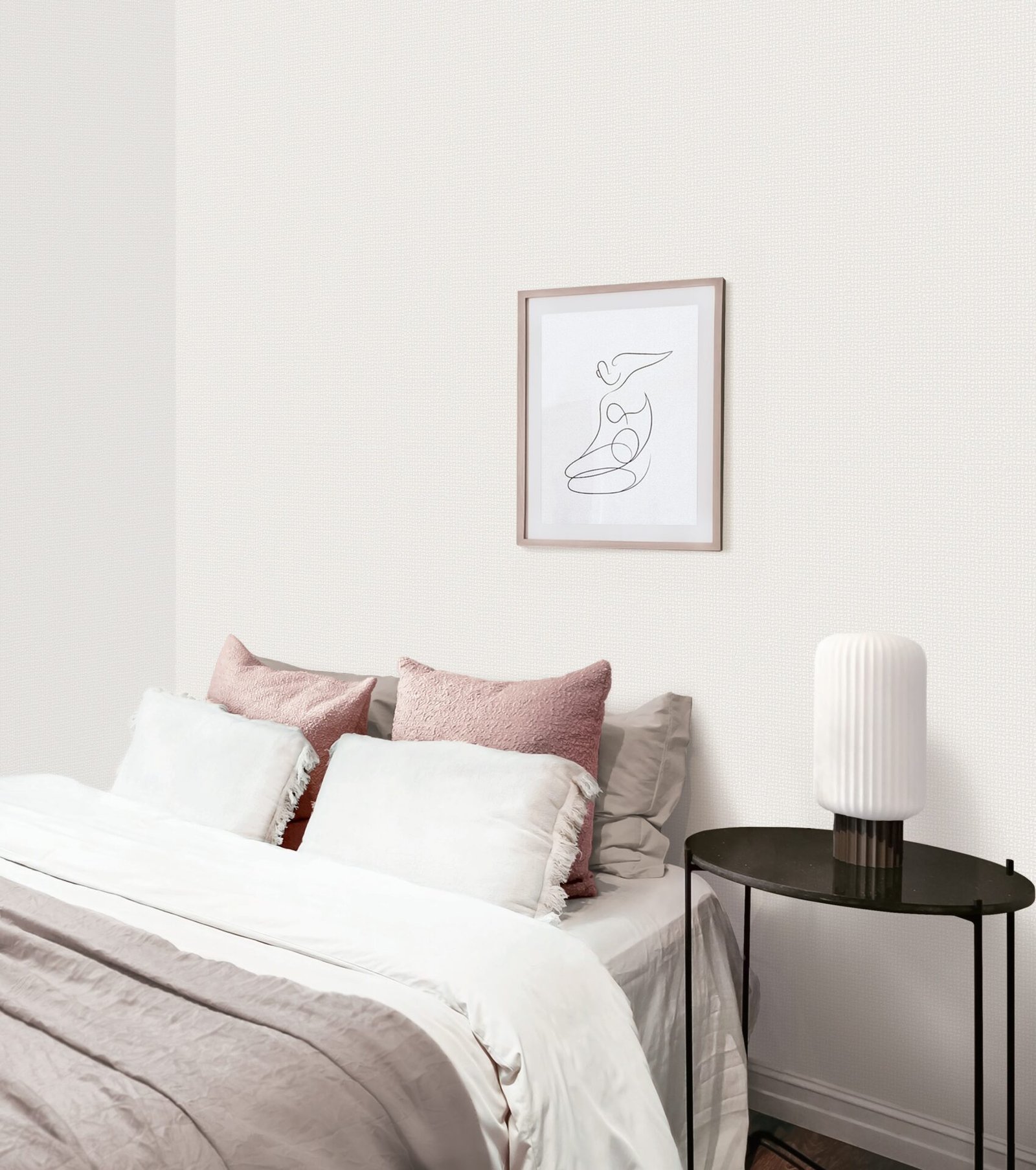 Minimal textured wallpaper for bedroom, living room, or modern interiors, available in multiple soft white and neutral colours with elegant fabric-style wall finish