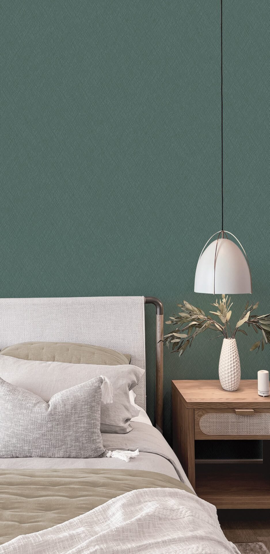 Modern green fabric texture wallpaper for bedroom and living room walls with elegant woven wall decor design.