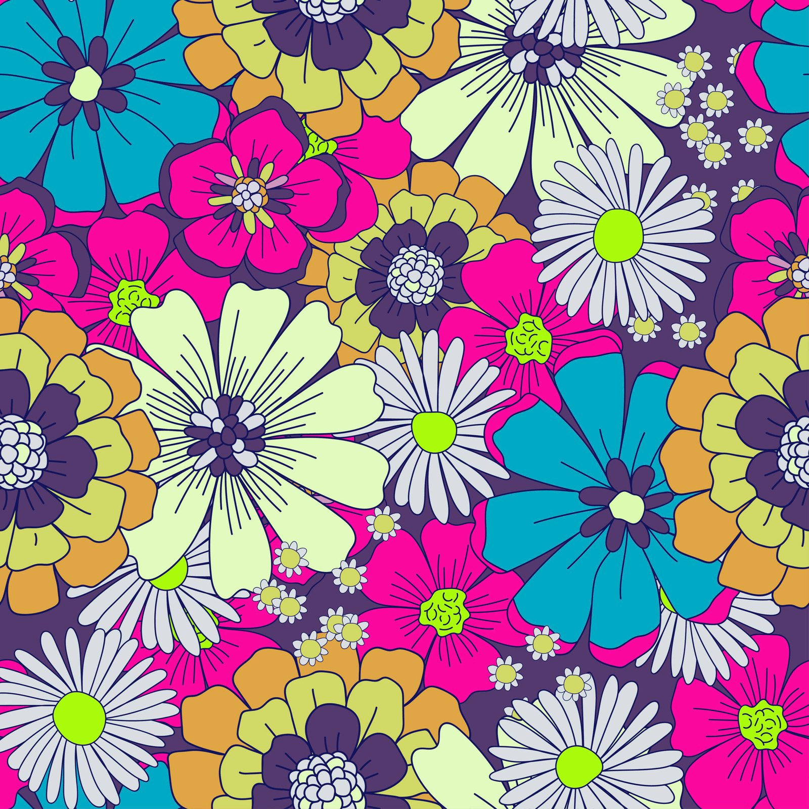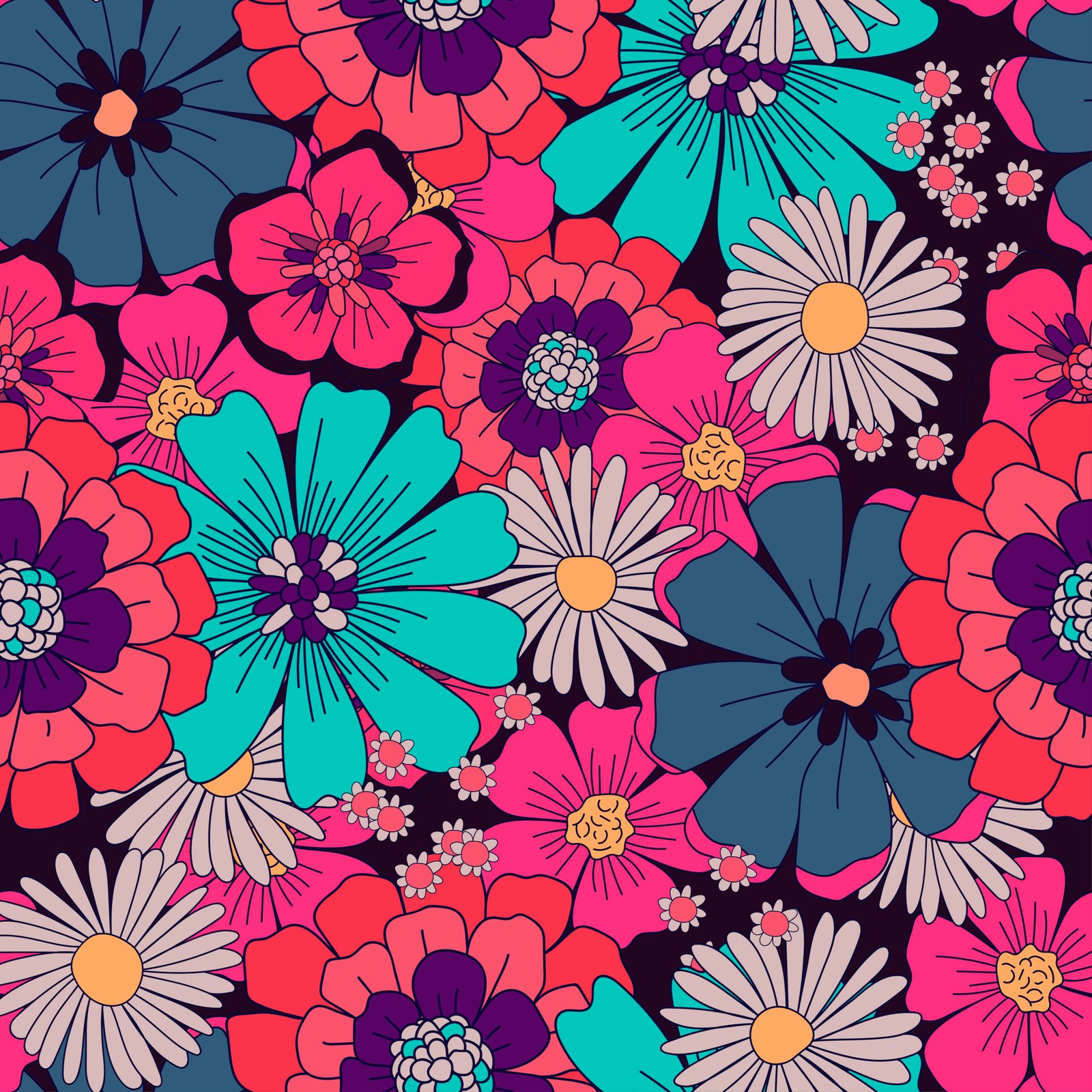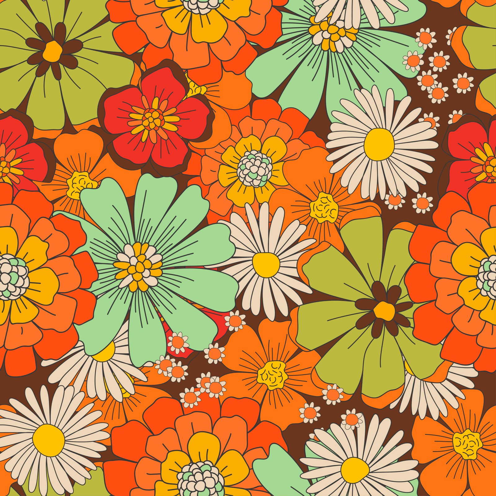 Retro floral wallpaper with large orange, red, yellow, green, and white flowers, vintage blossom patterns, botanical designs, and colorful nature‑inspired wall art.