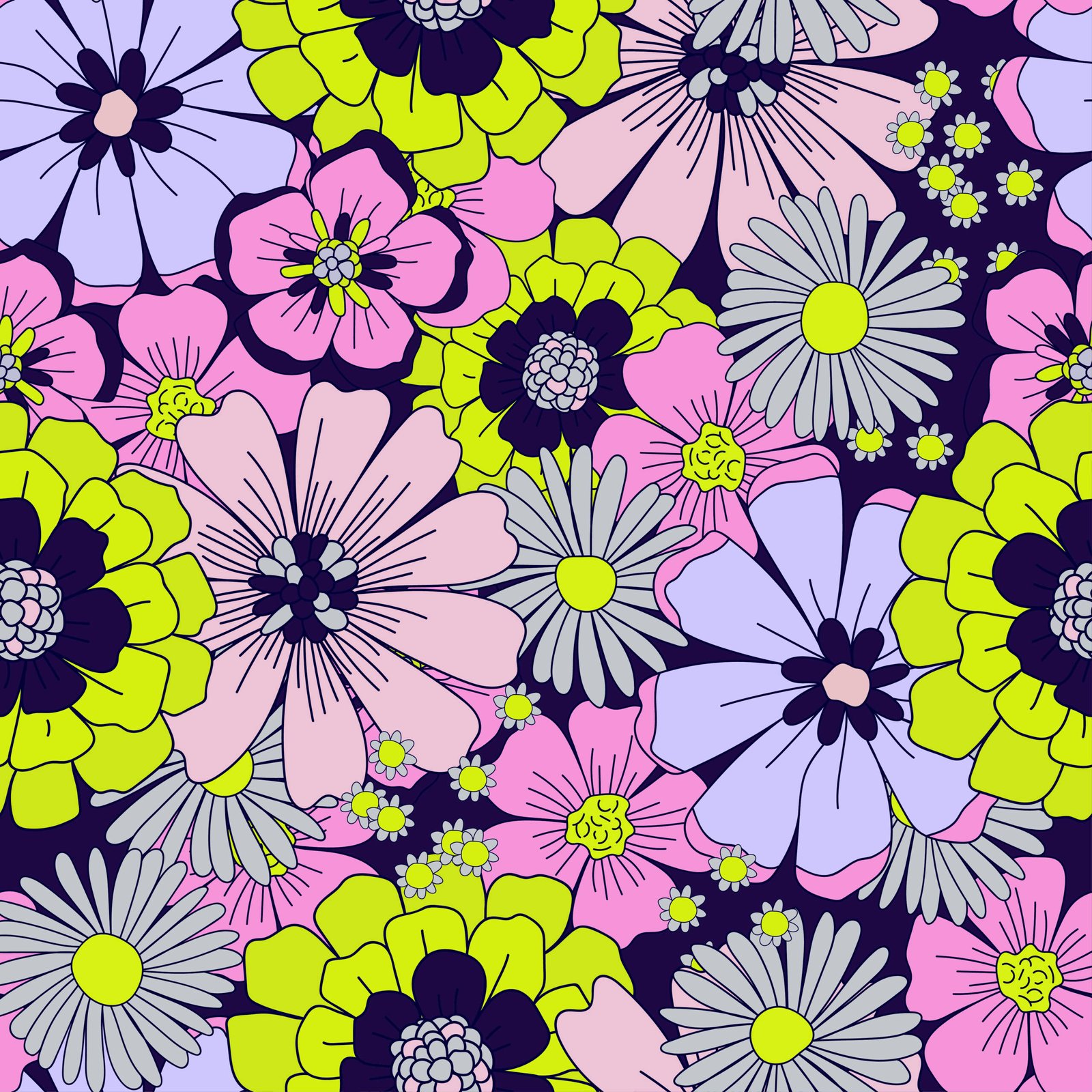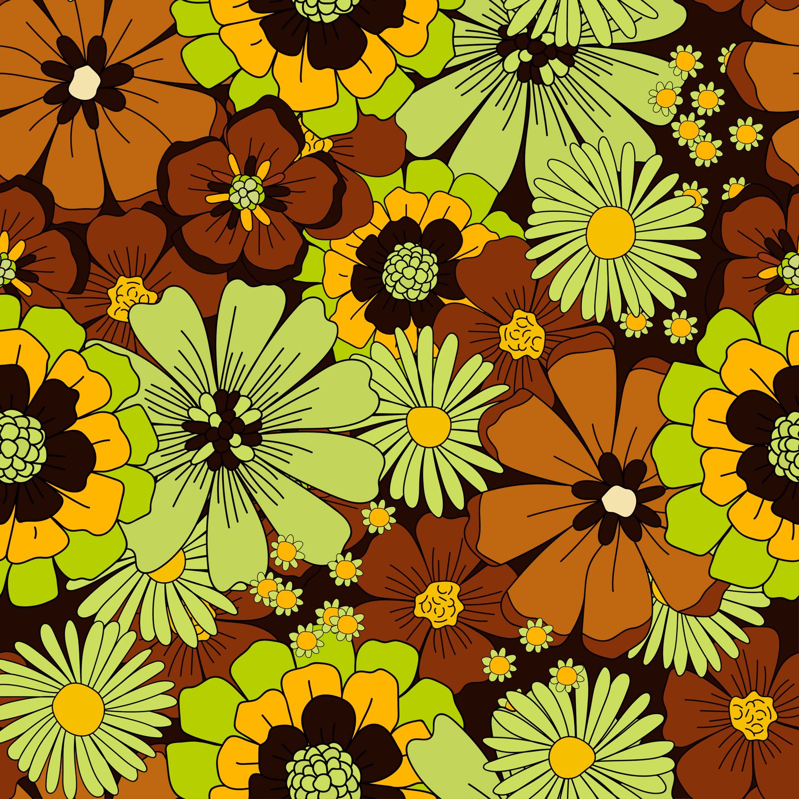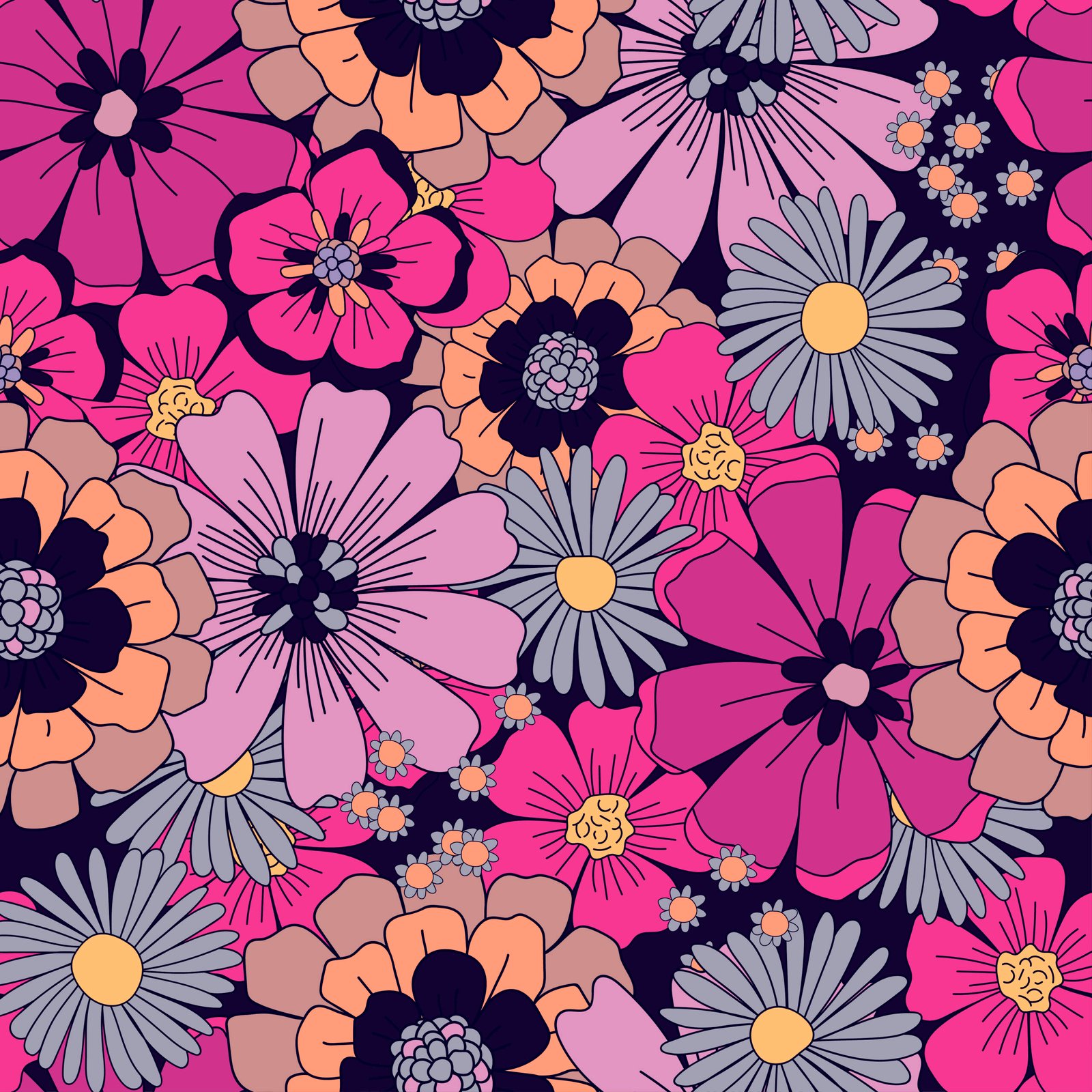 Retro floral wallpaper with large orange, red, yellow, green, and white flowers, vintage blossom patterns, botanical designs, and colorful nature‑inspired wall art.