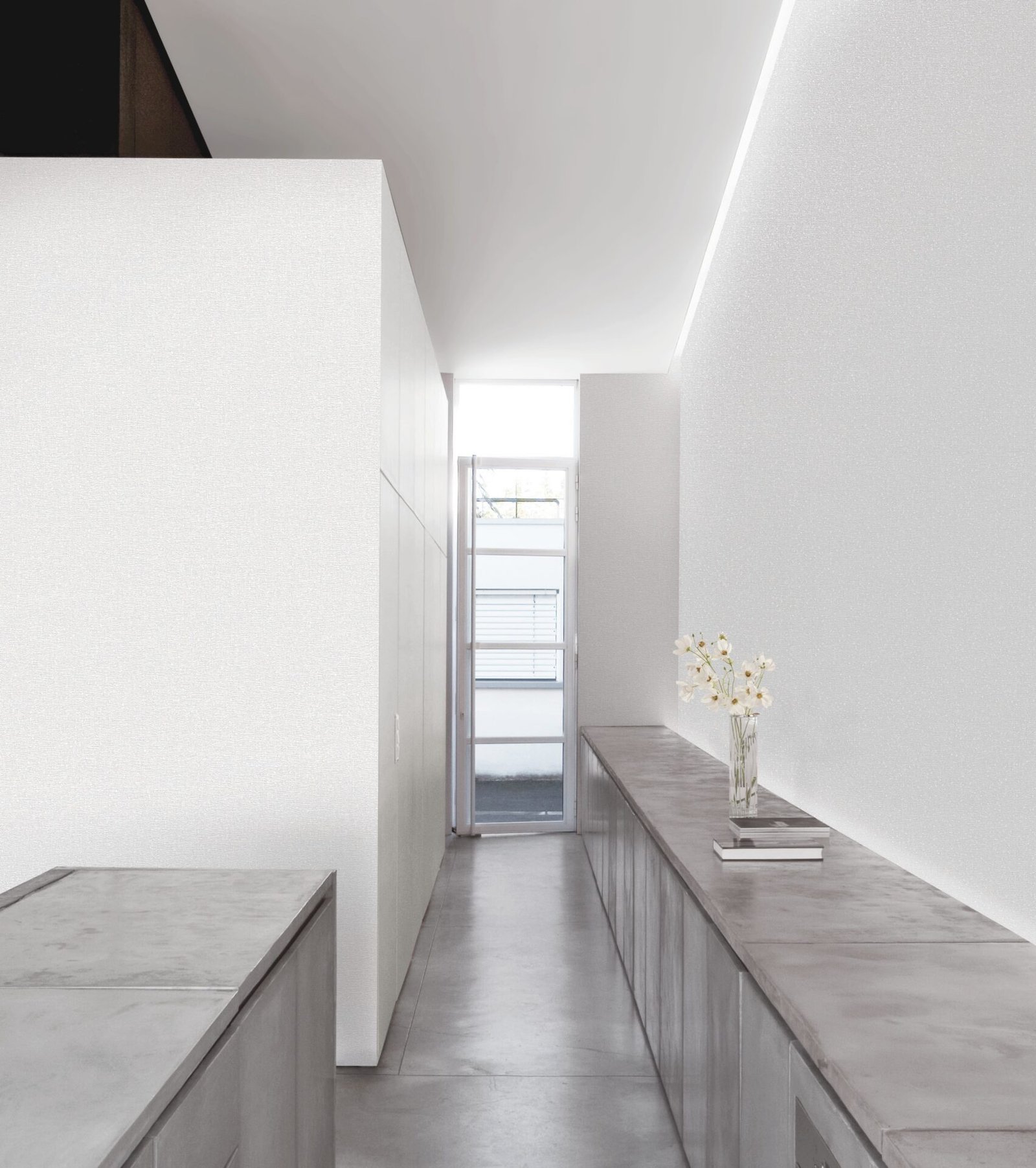 Luxury white textured wallpaper with subtle linen fabric effect for modern living room, hallway, or bedroom wall decor