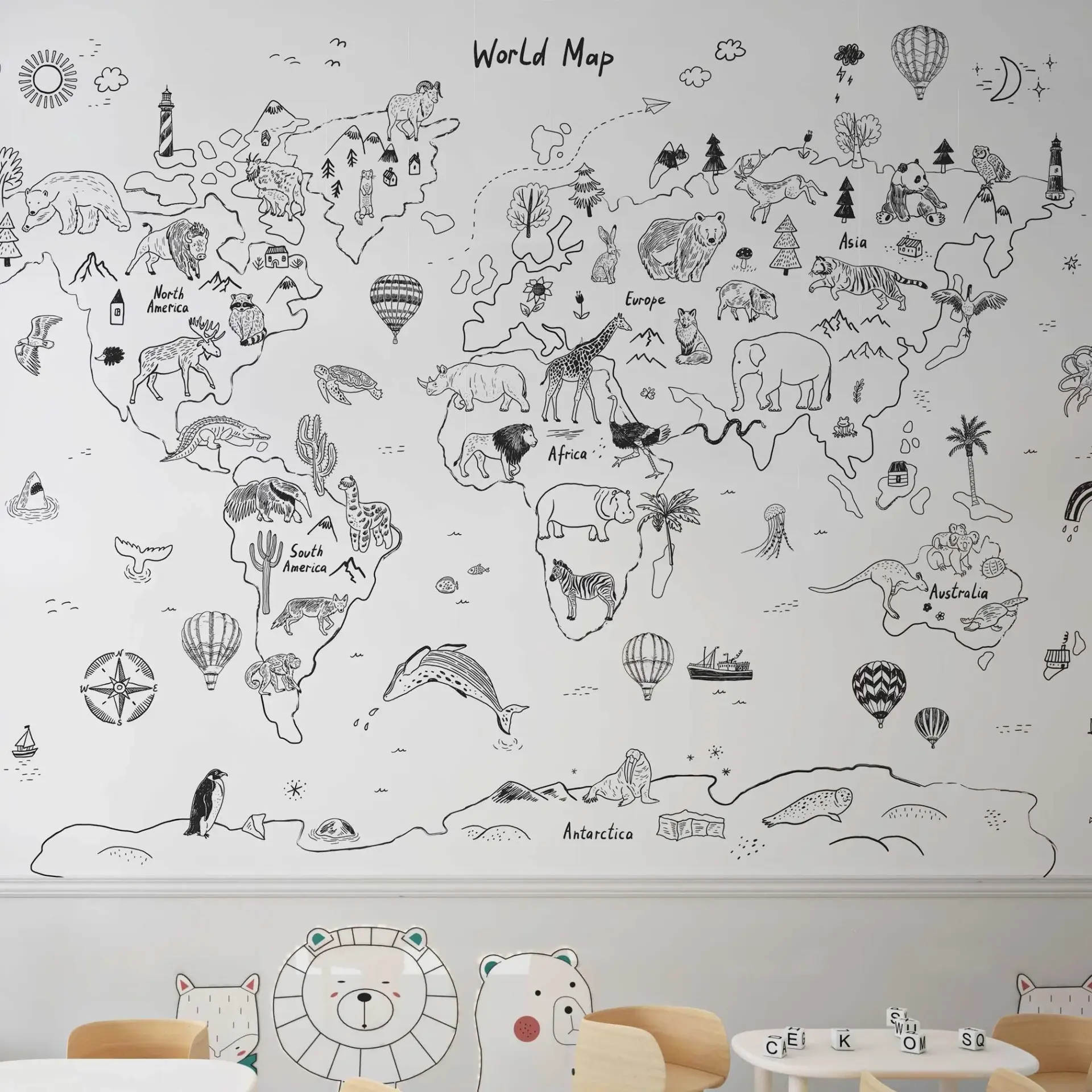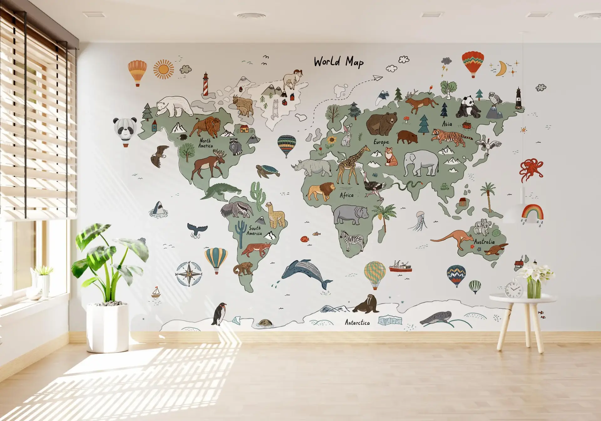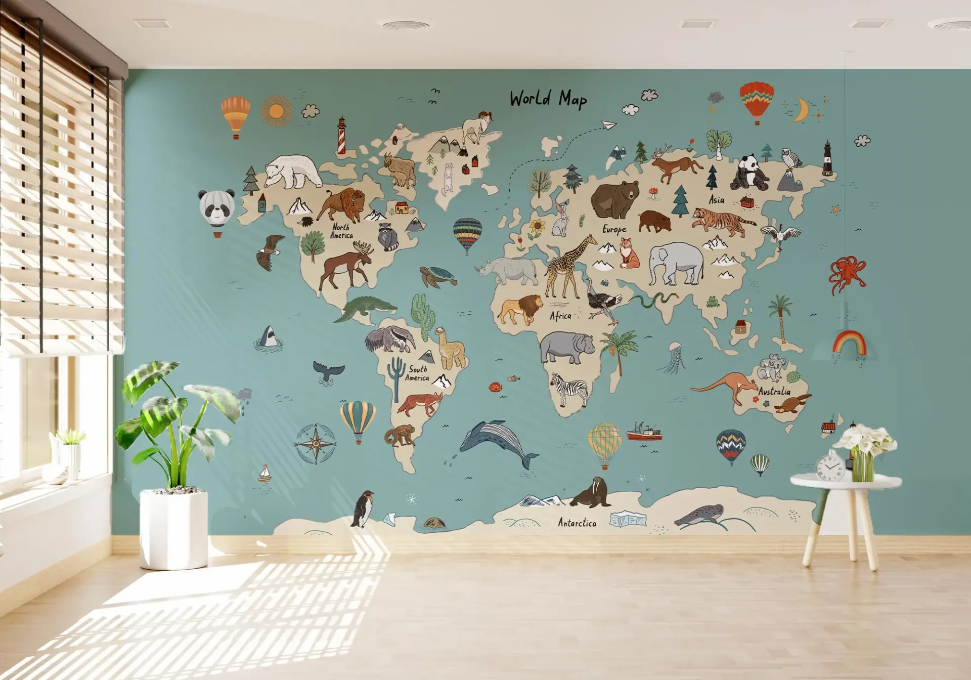 Educational world map kids wallpaper with animals for nursery, playroom, or child bedroom featuring a fun travel theme and soft illustrated wall art