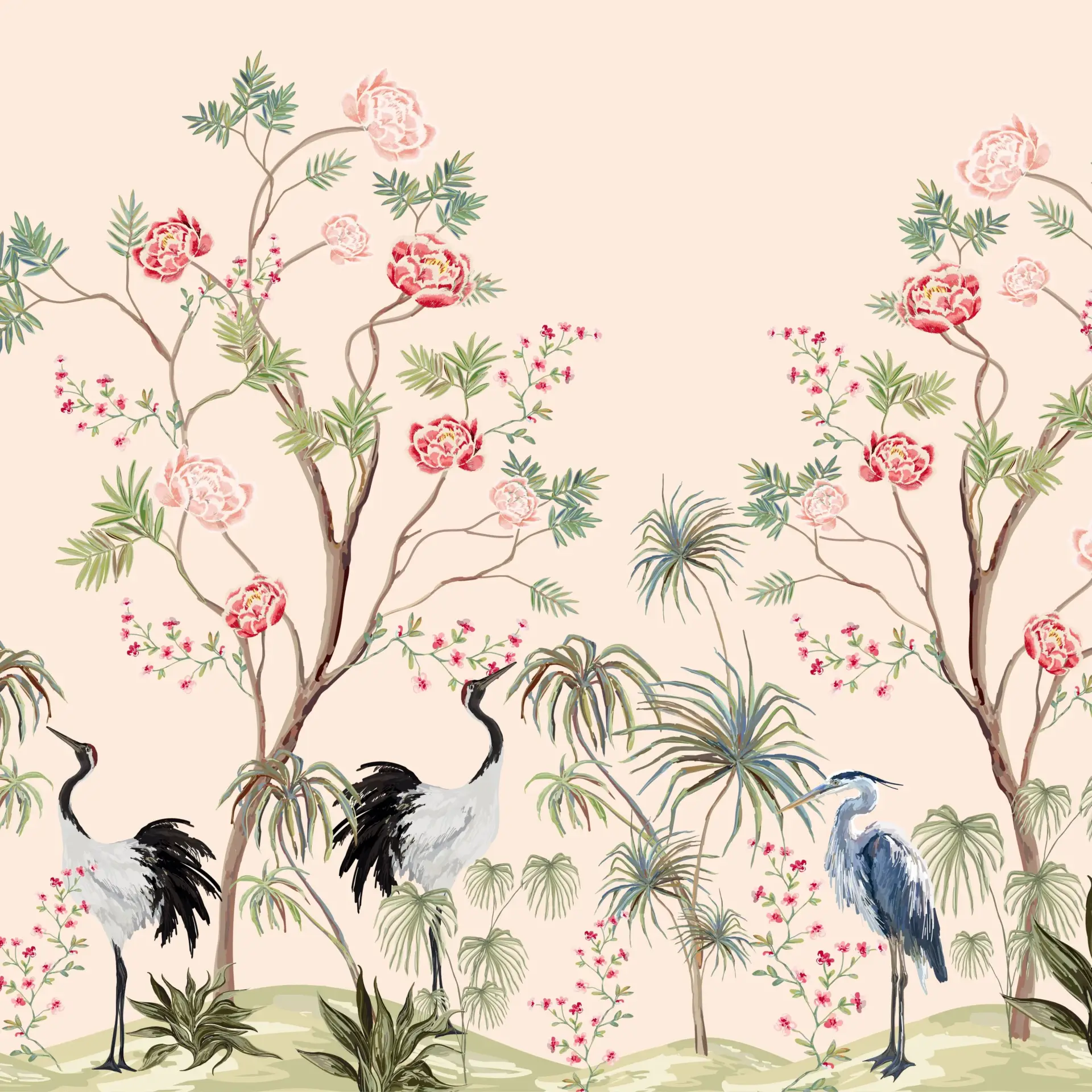 Luxury chinoiserie wallpaper with cranes, floral trees, and botanical elements for living room or bedroom wall decor in an elegant oriental style