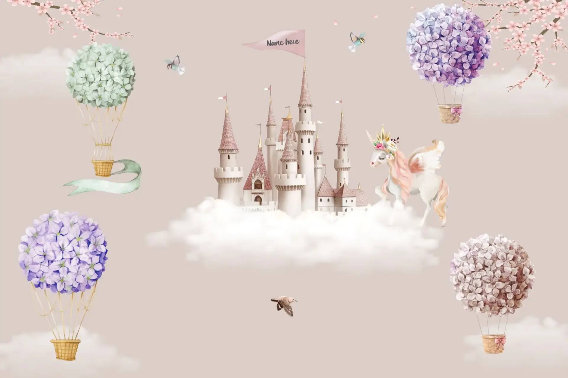 Dreamy princess castle kids wallpaper with unicorn, pastel flowers, and hot air balloons for girls bedroom or nursery