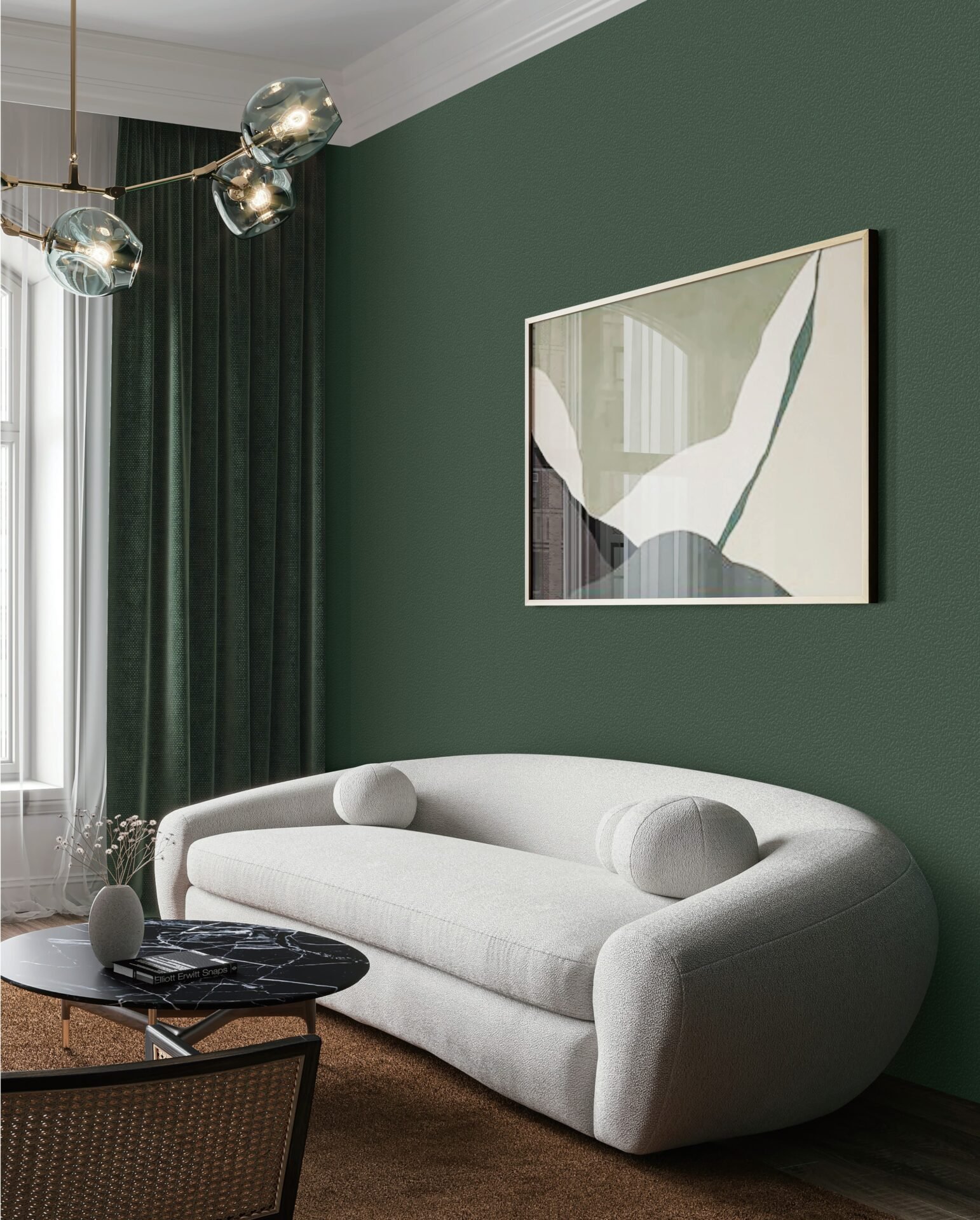 Luxury textured plaster wallpaper in deep green and neutral tones for living room, bedroom, or lounge featuring modern stucco wall finish
