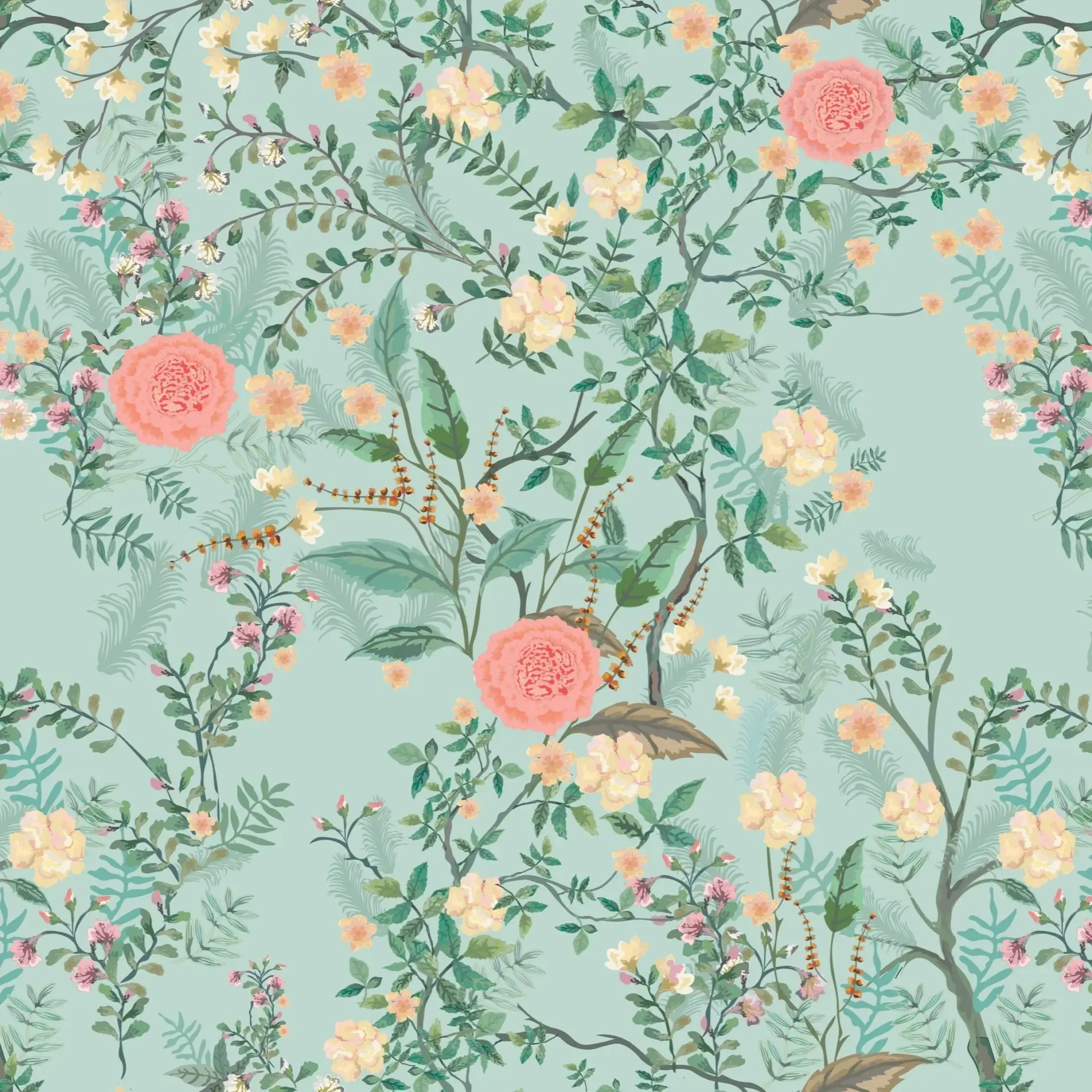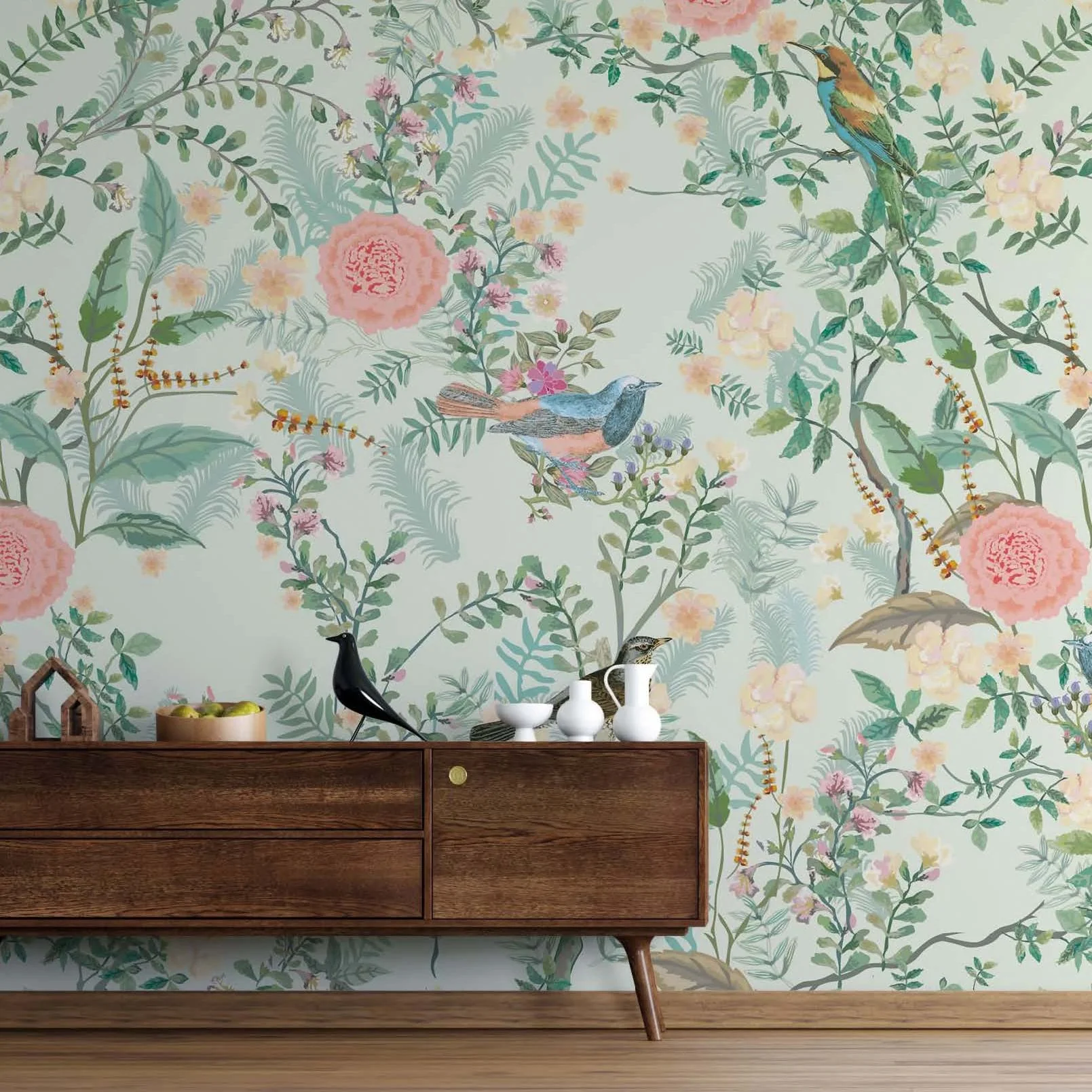 Elegant botanical floral wallpaper with birds and pastel blossoms for living room, bedroom or hall in soft sage green chinoiserie wall art style