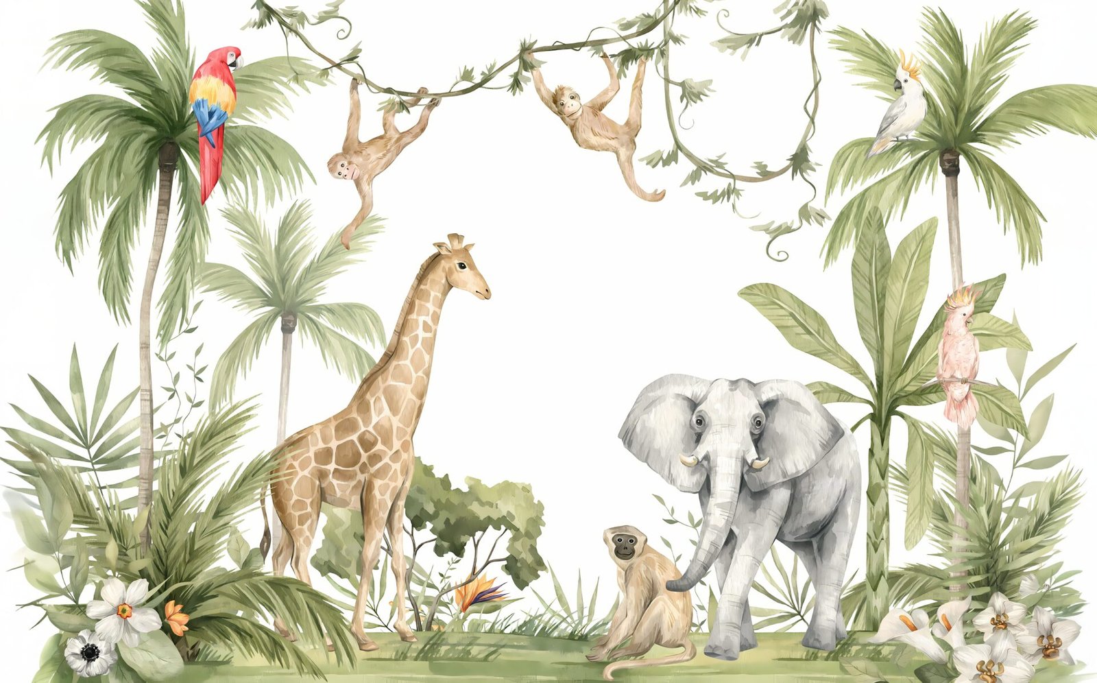 Cute jungle safari kids wallpaper with animals and tropical trees for nursery, playroom, or child bedroom wall decor