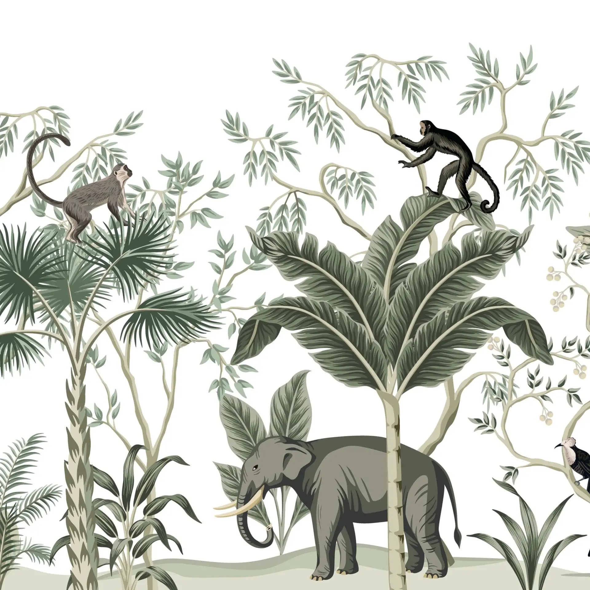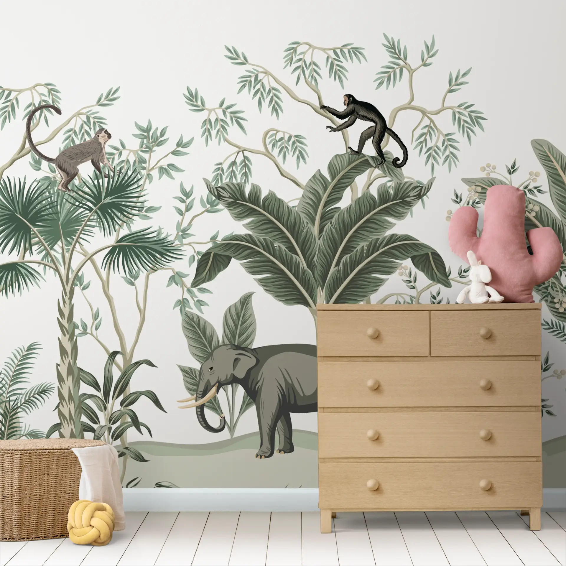 Cute jungle safari kids wallpaper with elephants and monkeys for nursery or child bedroom featuring soft green botanical forest wall art
